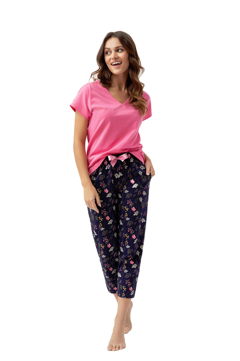 Piżama damska marki Luna, spodnie długości 7/8, drukowane, ozdobione kokardką. Góra jednobarwna, dekolt w serek, rękawy krótkie.