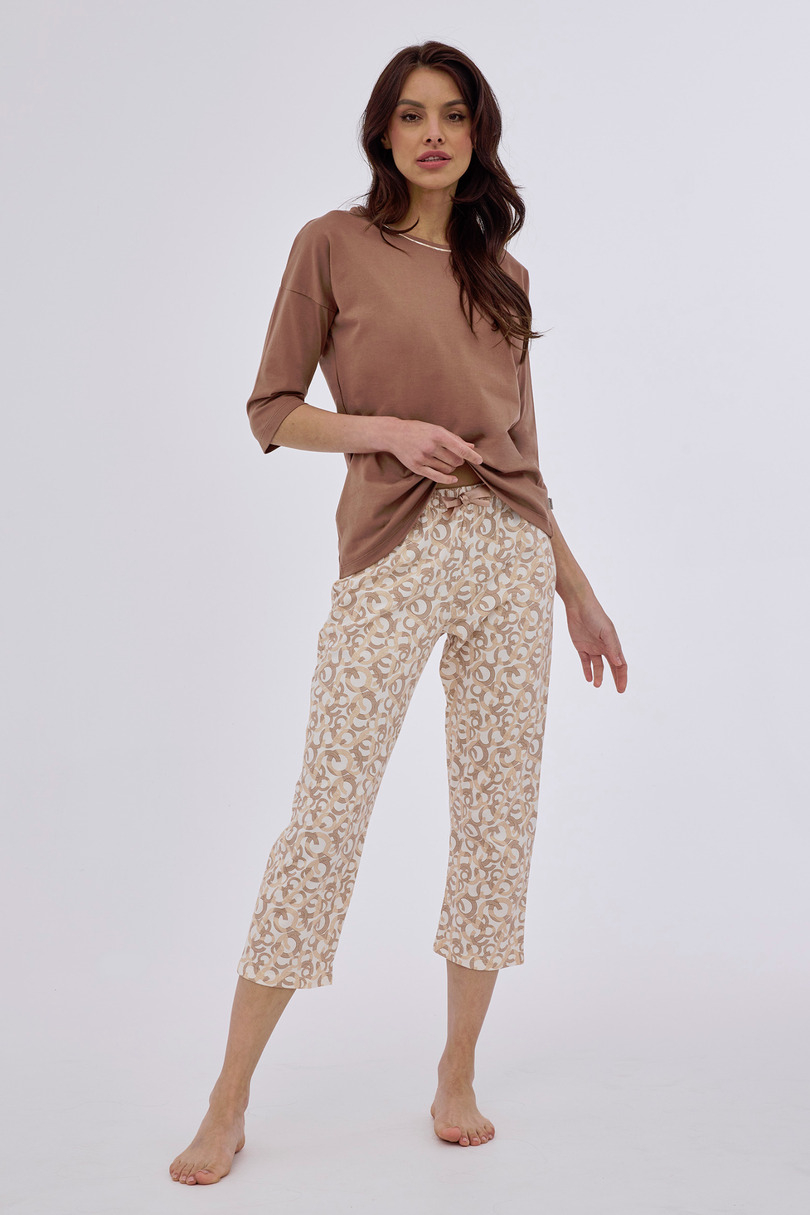 Piżama damska z rękawem długości 3/4, uszyta z jednolitej bawełny, Dekolt okrągłu, do kompletu wzorzyste spodnie długości 3/4, w pasie ozdobna kokarda. Pakowana w pudełko.