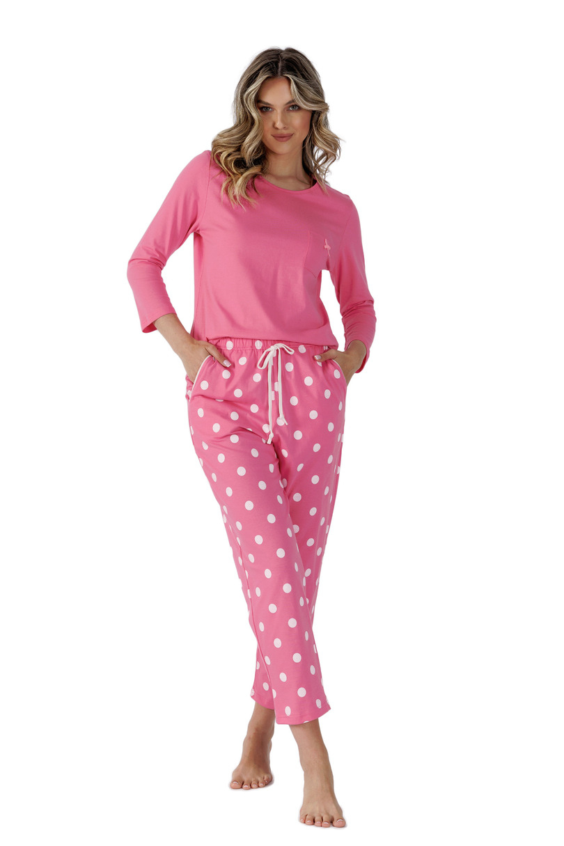 Piżama damska uszyta z delikatnej bawełny. Koszulka jednolita, z rękawem długości 7/8, dekolt okrągły, na wysokości klatki piersiowej ozdobna kieszonka. Do kompletu wzorzyste spodnie długości 7/8 z kieszeniami.
