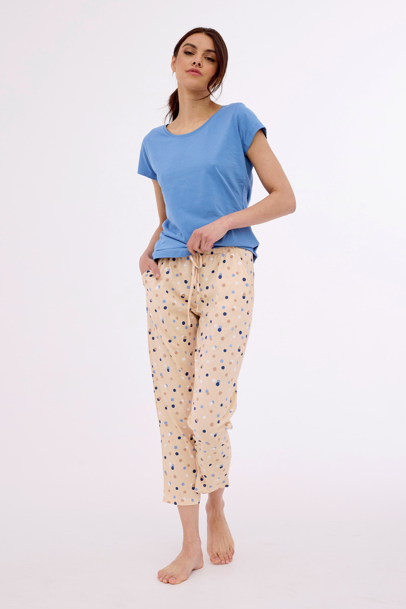Piżama damska z krótkim rękawem, uszyta z jednolitej bawełny, Dekolt okrągłu, do kompletu wzorzyste spodnie długości 3/4 z kieszeniami, w pasie ozdobny troczek. Pakowana w pudełko.