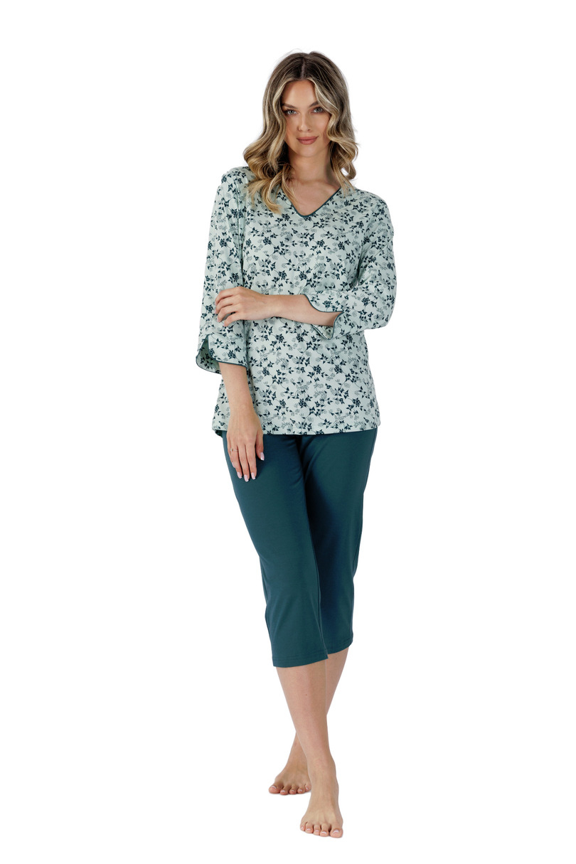 Piżama damska z rękawem długości 3/4, wzorzysta, dekolt w serek. Do kompletu jednolite spodnie długości 3/4.