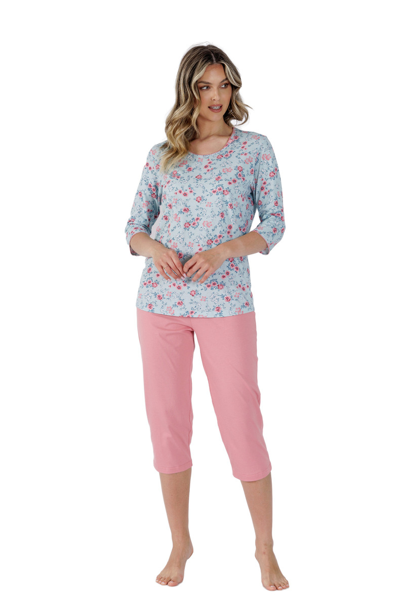 Piżama damska z rękawem długości 3/4, wzorzysta, dekolt w serek. Do kompletu jednolite spodnie długości 3/4. Skład: 100% bawełna