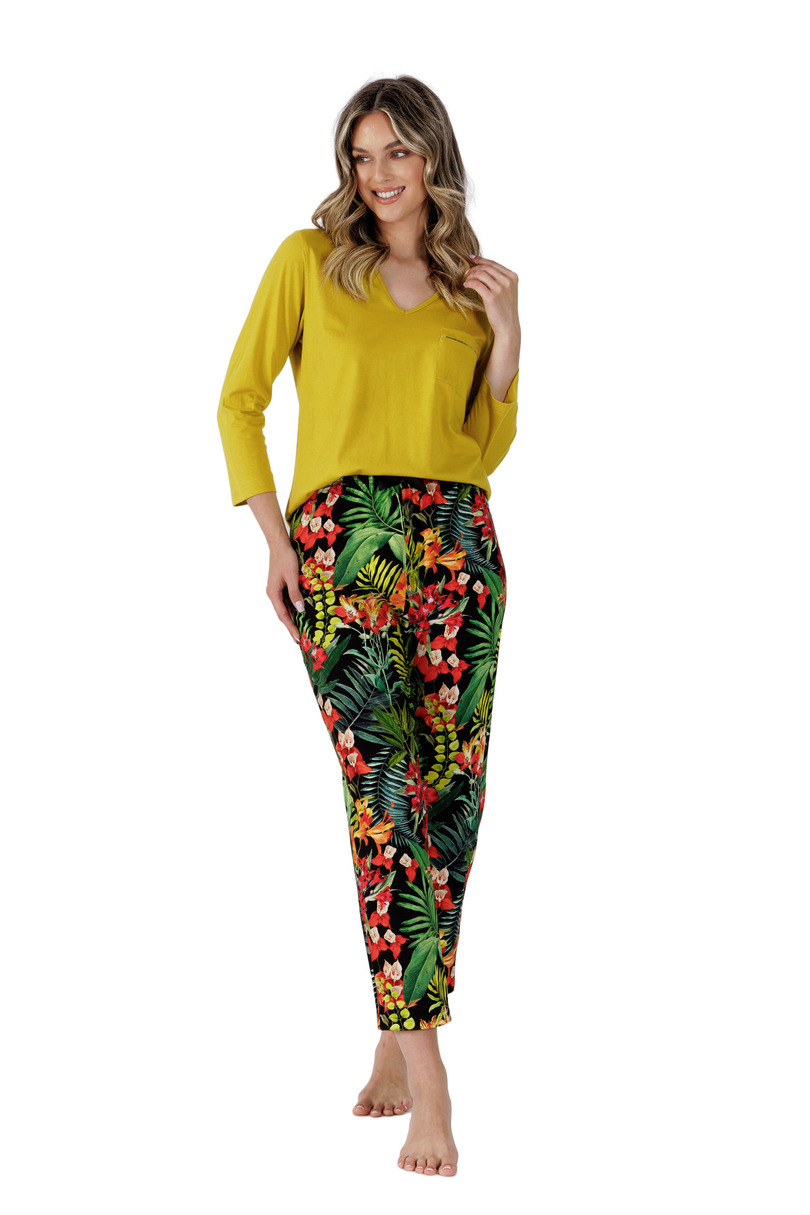Piżama damska z rękawem długości 7/8 uszyta z delikatnej bawełny. Dekolt w serek, na wysokości klatki piersiowej kieszonka. Do kompletu wzorzyste spodnie długości 7/8.