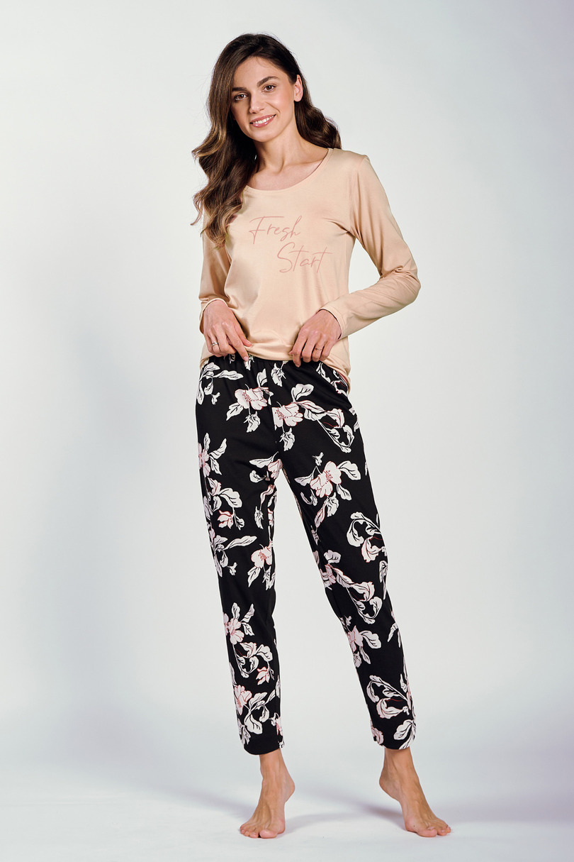 Piżama damska z długim rękawem, uszyta z delikatnej bawełny. Dekolt okrągły, przód ozdobniony nadrukiem. Do kompletu wzorzyste długie spodnie. Skład: 100% Bawełna