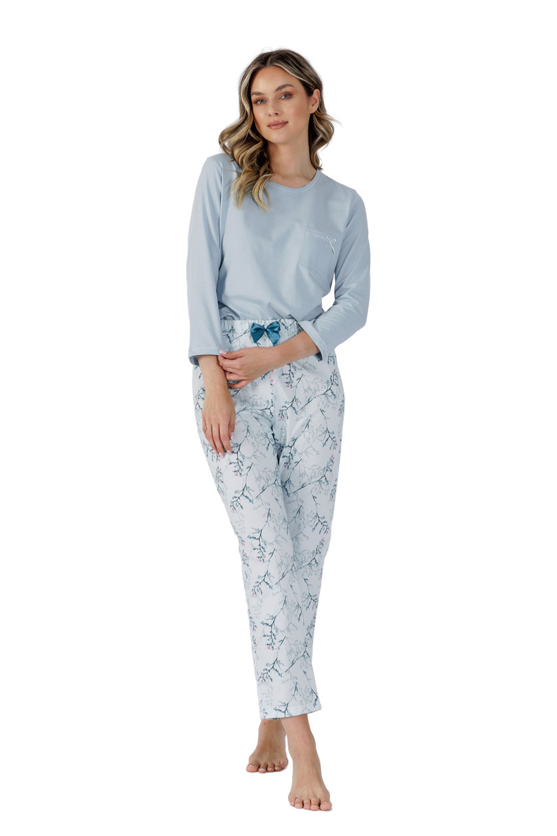 Piżama damska z rękawem długości 7/8, dekolt okrągły, na wysokości klatki piersiowej kieszonka. Do kompletu wzorzyste spodnie długości 7/8. W pasie odobzna kokrada. Skład: 100% Bawełny