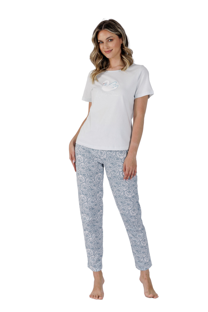 Piżama damska z krótkim rękawem, uszyta z delikatnej bawełny, przód ozdobiony nadrukiem. Do kompletu spodnie długości 7/8 wzorzyste z prostymi nogawkami.