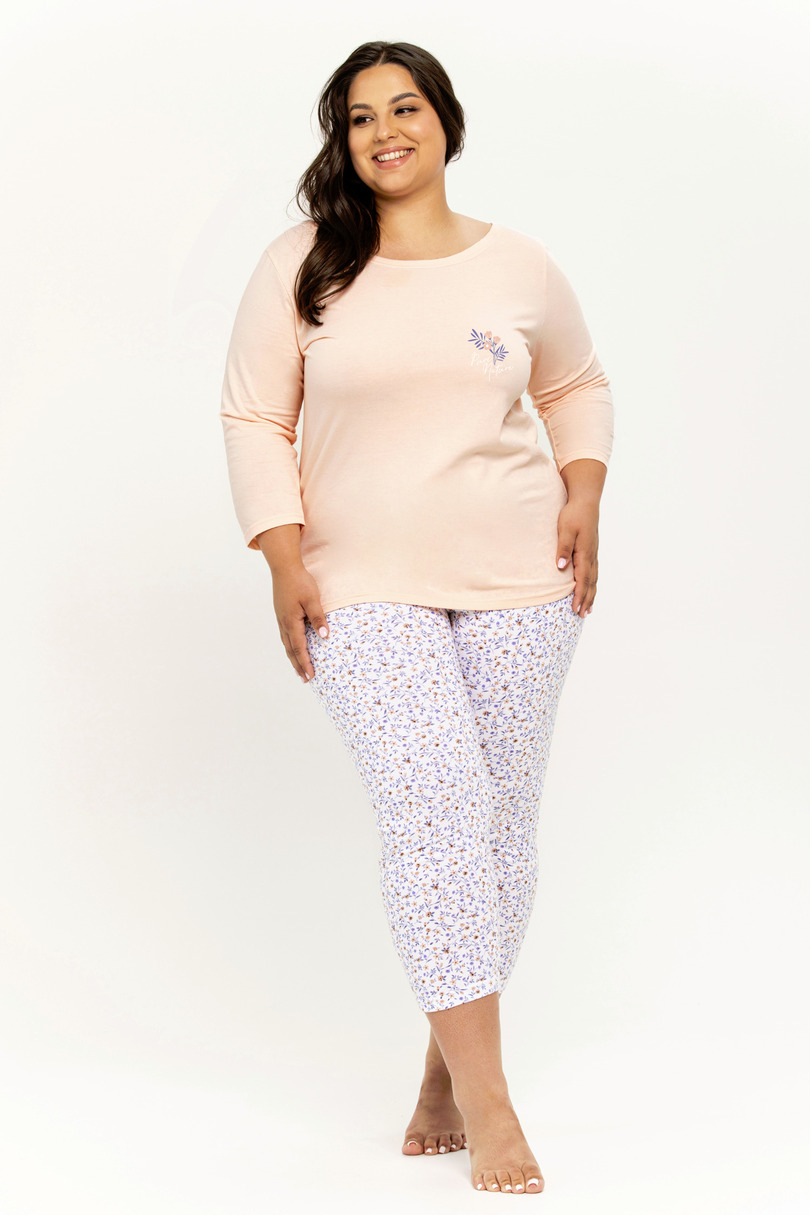 Piżama damska z rękawem długości 7/8, jednolita, na wysokosci klatki piersiowej nadruk. Do kompletu wzorzyste spodnie długości 7/8.