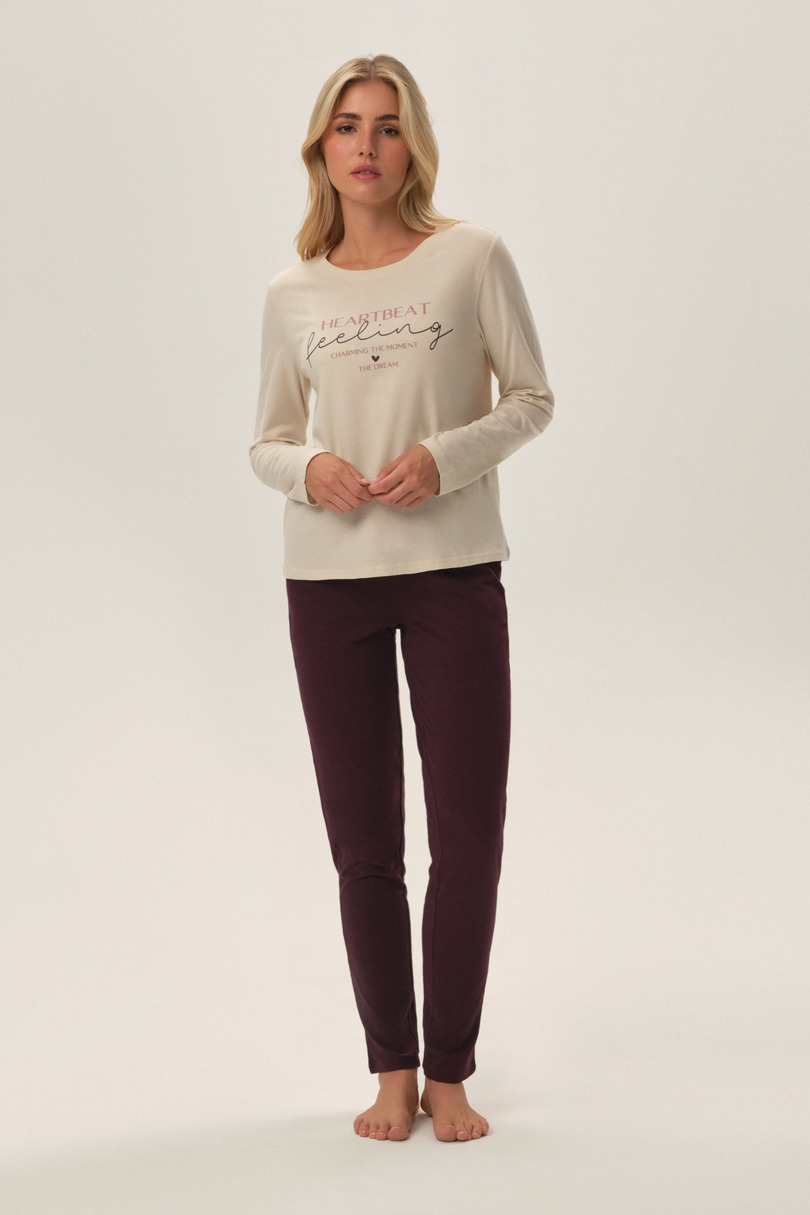 Piżama damska wykonana z delikatnej bawełny. Koszulka z długim rękawem, spodnie długie, wzorzyste. Dekolt okrągły.
