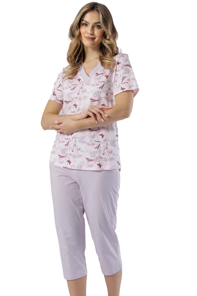 Piżama damska z krótkim rękawem, uszyta z delikatnej bawełny, dekolt w serek z kontrastowym wykończeniem. Do kompletu jednolite spodnie długości 3/4. Skład: 100% Bawełna