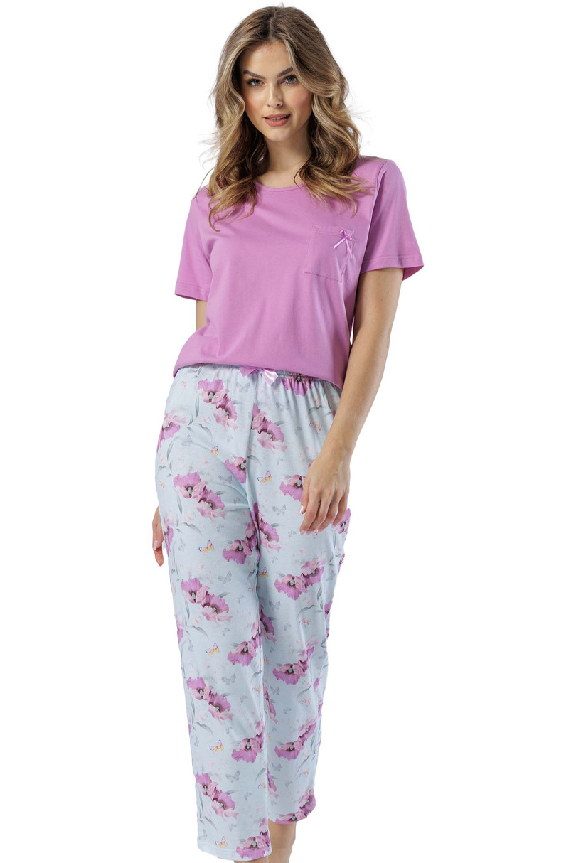 Piżama damska z krótkim rękawem, uyszta z bawełny, dekolt okrągły, na wysokości klatki piersiowej kieszonka. Do kompletu wzorzyste spodnie długości 7/8, w pasie dekoracyjna kokarda. Skład: 100% Bawełna