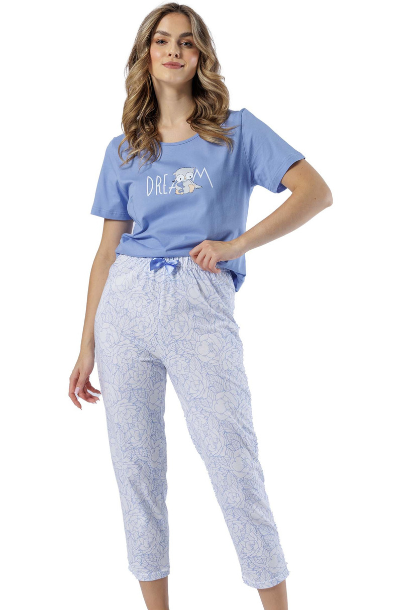 Piżama damska OKTAWIA 1573 LEVEZA to idealne połączenie wygody i stylu. Wykonana w 100% z wysokiej jakości bawełny, zapewnia miękkość, przewiewność i komfort noszenia. Koszulka z krótkim rękawem i okrągłym dekoltem ozdobiona jest modnym, kolorowym nadrukiem, który dodaje uroku. Do kompletu dołączone są spodnie o długości 7/8, gwarantujące swobodę ruchów i doskonałe dopasowanie. Doskonały wybór na spokojny sen i domowy relaks! Skład: 100% Bawełna