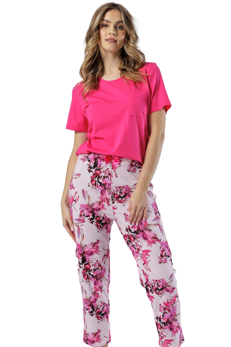 Piżama damska z krótkim rękawem, uyszta z bawełny, dekolt okrągły, jednolita, na wysokości klatki piersiowej kieszonka. Do kompletu wzorzyste spodnie długości 7/8, w pasie dekoracyjna kokarda. Skład: 100% Bawełna