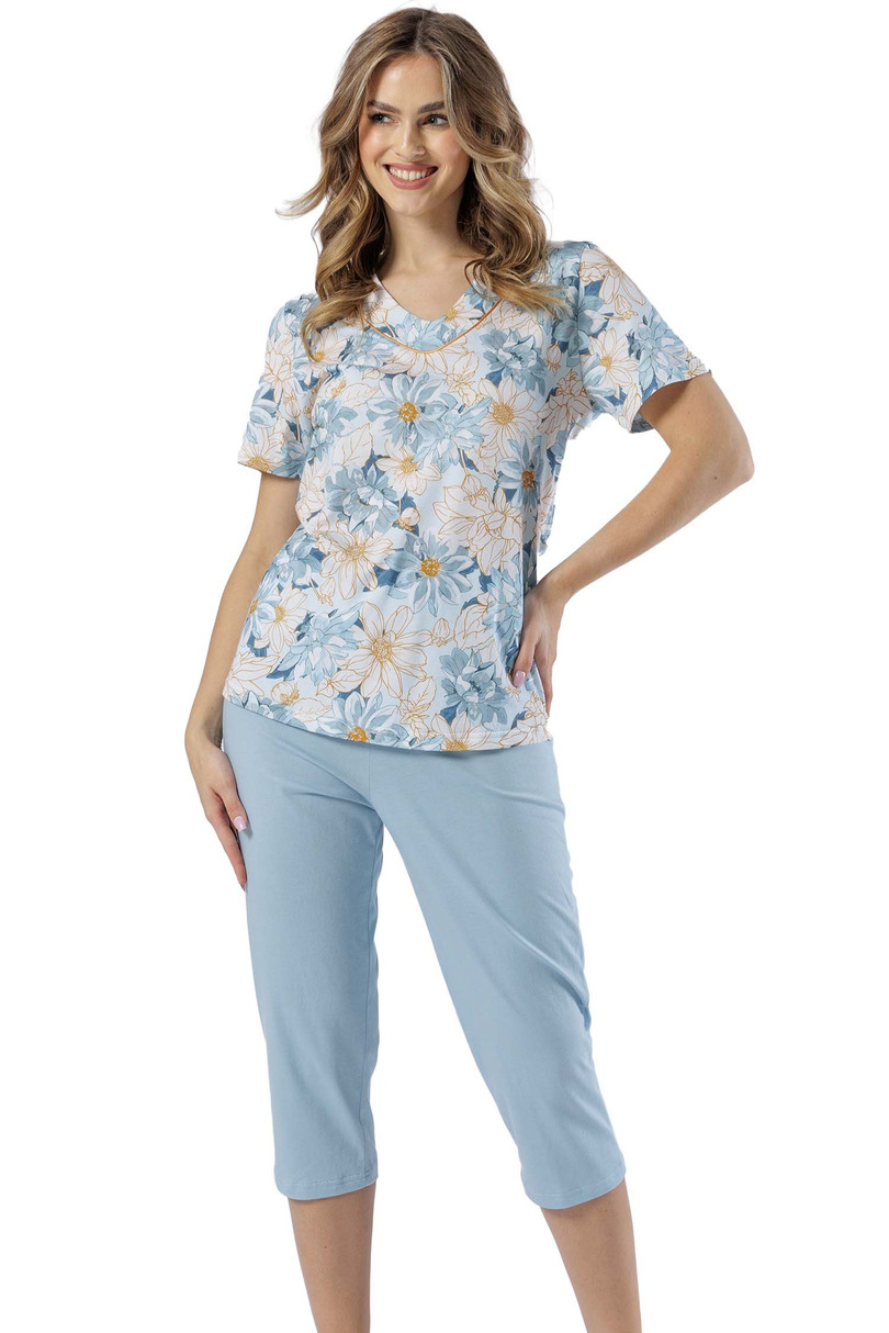 Damska piżama Izaura 1586 Leveza to połączenie elegancji, wygody i najwyższej jakości materiałów. Bluzka wykonana z uszlachetnionej bawełny jest wyjątkowo miękka i delikatna dla skóry. Dekolt w serek ozdobiony subtelną atłasową lamówką nadaje jej stylowego charakteru. Spodnie o długości 3/4, wykonane w 100% z bawełny, zapewniają swobodę ruchów i komfort podczas snu. Całość utrzymana jest w pięknym odcieniu morskiego lazuru, który podkreśla kobiecy styl. Doskonała na ciepłe noce oraz jako stylowa bielizna domowa! Skład: 100% Bawełna