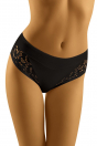 Bawełniane figi z ażurowym zdobieniem wokół ud. Nieco wyższe, o klasycznym kroju, bardzo wygodne. Ażurowy wzór optycznie wysmukla linię bioder. Polski producent.