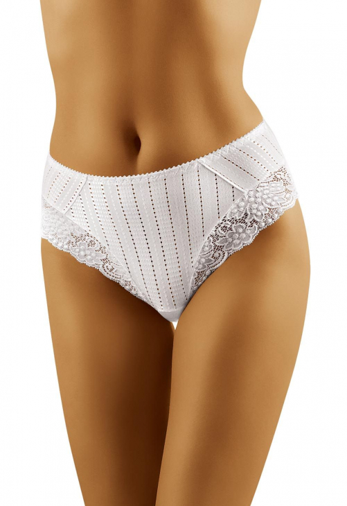 Eleganckie figi, w których na szczególną uwagę zasługują piękne, koronkowe dopełnienia zdobiące okolice ud. Nieco pełniejsze, o elastycznych właściwościach. Wyróżnione modną, paseczkową mozaiką, która figlarnie zdobi przód bielizny.