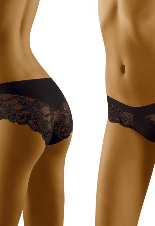 Gustowne figi z koronkowym wykończeniem. Koronka - wykwintnie kwiecista - stylowo zdobi zarówno boki bielizny, jak i sporą część pośladków. Wygodny i zarazem zmysłowy model fig. Skład: 83% poliamid, 17% elastan.
