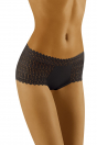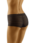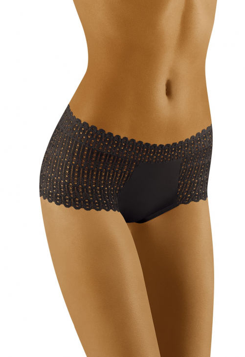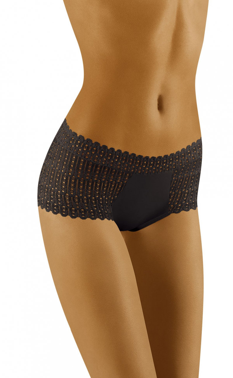 Efektowne figi niemal całkowicie wykonane z koronki. Krój a'la szorty. Tył i boki ażurowe, delikatne, bardzo kobiece. Przód uzupełnia wstawka z gładkiej, komfortowej tkaniny, która nie prześwituje. Skład: 83% poliamid, 17% elastan.