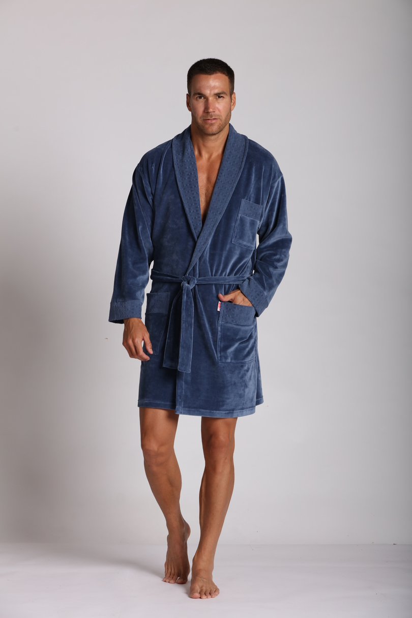 Krótki szlafrok męski z weluru, z kołnierzem. Przewiązywany paskiem.