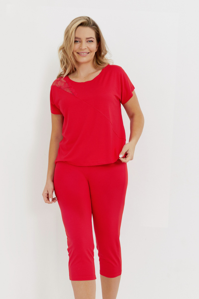 Piżama damska z krótkim rękawem uszyta z wysokiej jakości wiskozy. Na ramieniu wszyta kontrastująca koronka. Do kompletu spodnie typu rybaczki.