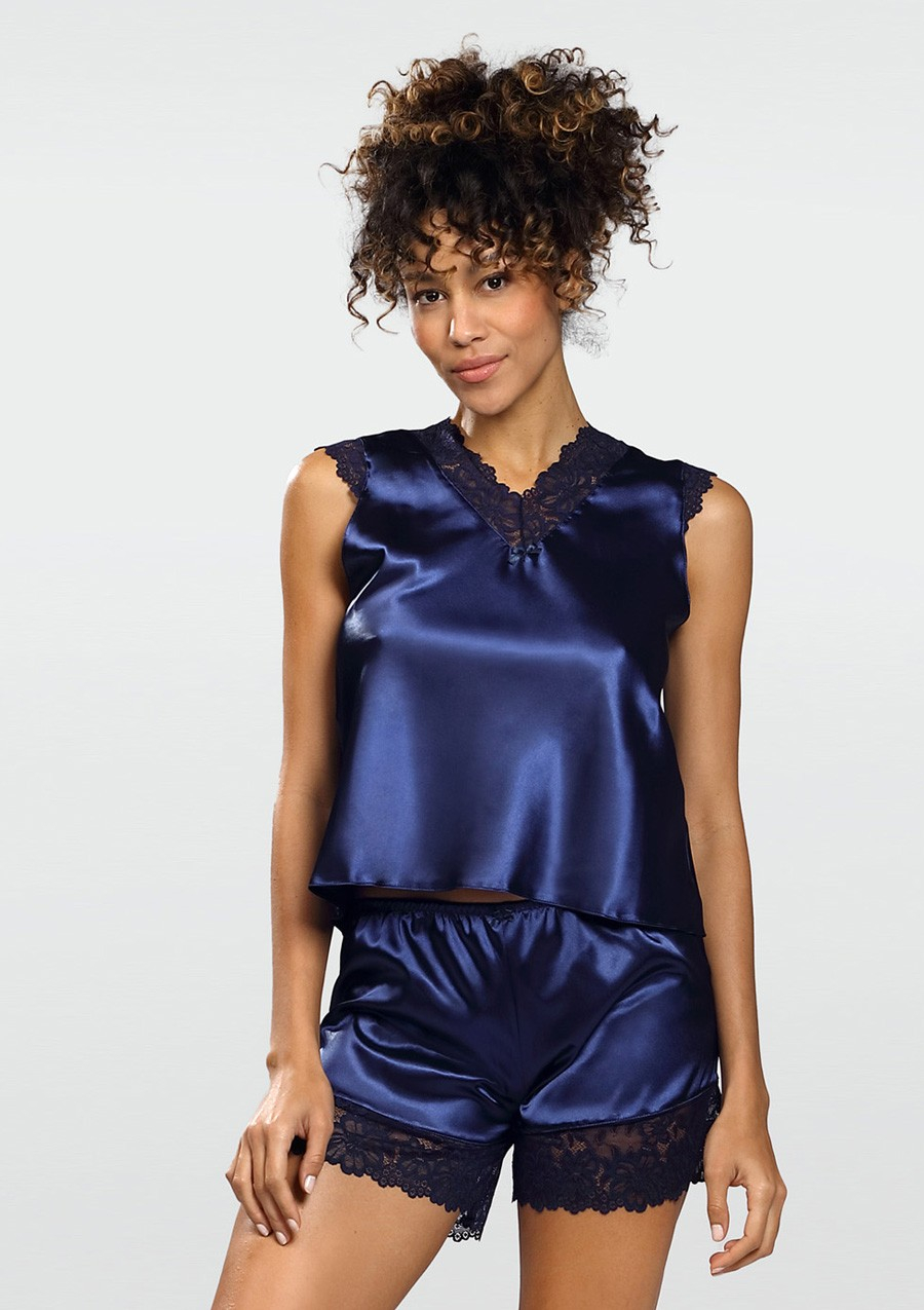 Szukasz idealnej dla siebie piżamki? Co powiesz na Komplet Skaylor? Ta pizama satynowa składa się z koszulki oraz krótkich spodenek z elastyczną gumką w pasie. Top posiada szerokie naramki. Obydwie są obszyte malutkim koronkowym materiałem w kolorze granatowym. To sprawia, że koszulka zyskuje krótki rękaw. Ta sama kwiecista koronka jest również wszyta przy dekolcie oraz na zakończeniu nogawek. Na środku biustu oraz na górze spodenek przyszyta jest urocza, mała kokardka. Komplet Skaylor wykonany jest z delikatnego materiału satynowego. Przekonaj się jak przyjemnym uczuciem jest dotyk chłodnej satyny na nagim ciele. Komplecik ten dostępny jest w kolorze granatowym. Jeśli spodobał Ci się ten model, zachęcamy Cię do dokładniejszego zapoznania się z naszą ofertą. Nie zapomnij jeszcze sprawdzić naszej tabeli z rozmiarówką. W końcu odpowiednio dobrana bielizna może zdziałać cuda!  Zapraszamy!