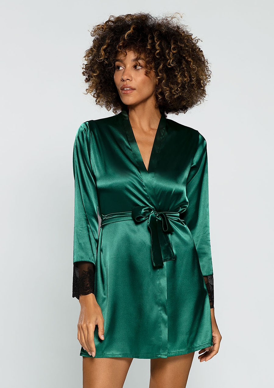 Prosta i klasyczna - dla jednych zbyt nudna, dla innych z kolei seksowna i zmysłowa. Podomka Hailey wykonana jest z przyjemnego satynowego materiału. Po założeniu szlafroczka, trudno będzie się z nim później rozstać. Podomka uszyta jest według klasycznego wzoru - sięga przed kolana oraz posiada długie, luźne rękawki, które zakończone są czarną koronką. Szlafroczek przewiązywany jest cienkim paskiem, dzięki któremu każda kobieta może podkreślić swoją talię, a przy okazji podkreślić swoje kształty. Podomka Hailey dostępna jest w kolorze butelkowej zieleni. Jest to niezywkle modny odcień szlafroczka satynowego. Gotowa na to, aby poczuć się komfortowo i wygodnie, a zarazem elegancko z Dkaren?