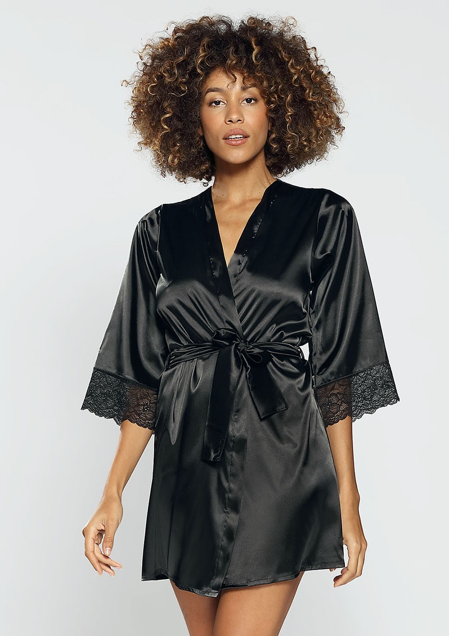 SATYNOWA ZWIENWNA PODOMKA Z SZERSZYMI RĘKAWAMI ORAZ SATYNOWYM PASKIEM. GÓRĘ PLECÓW ORAZ RĘKAWKI ZDOBI DELIKATNAW DOTYKU KORONKA. DOSTĘPNE WSZYSTKIE WESRJE SATYNY Z CZARNĄ KORONKĄ.