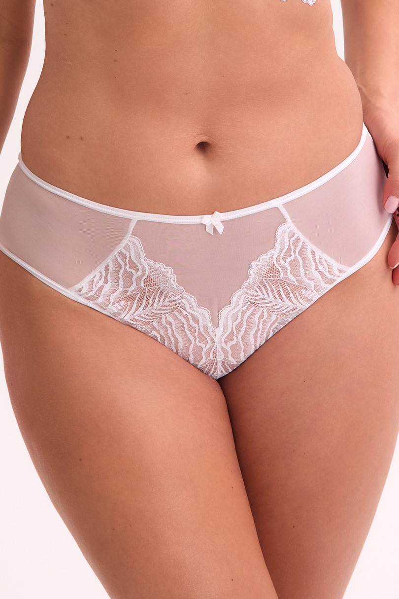 Figi pełne Isla w kolorze białym to harmonijne połączenie wyrafinowanej koronki i transparentnego tiulu, zaprojektowane z myślą o kobietach ceniących elegancję i wygodę. Z przodu delikatna koronka nadaje figom romantycznego charakteru, podczas gdy boczne i tylne wstawki z elastycznego tiulu optycznie wysmuklają sylwetkę, zapewniając lekkość i przewiewność. Tył dodatkowo zdobi koronka przy nogawkach, co subtelnie podkreśla linię pośladków. Komfort noszenia gwarantuje miękka mikrofibra oraz bawełniany klinek, który zapewnia higienę i dopasowanie. Elastyczna taśma w pasie i przy wykończeniach nogawek delikatnie trzyma figi na miejscu, nie powodując ucisku. Subtelna kokardka z przodu to stylowy detal, który dopełnia całość. Idealne na co dzień i na specjalne okazje.