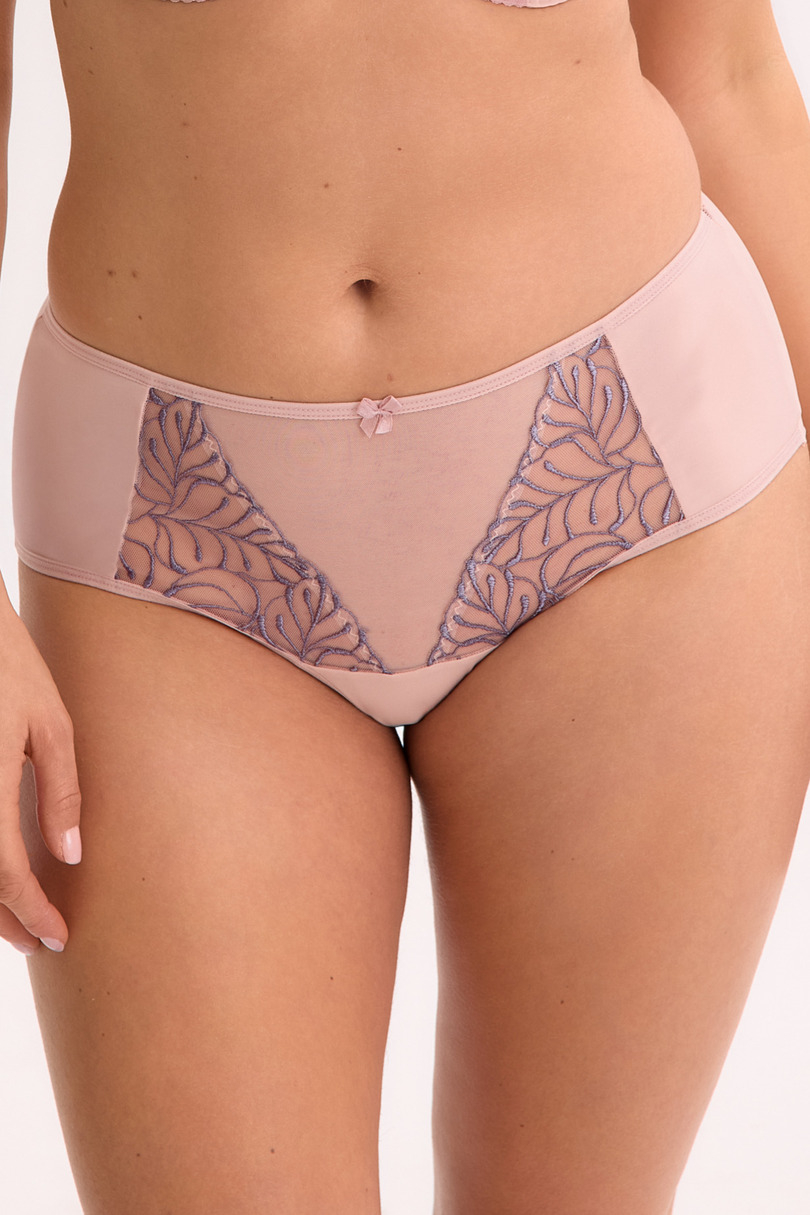 Wysokie figi w odcieniu pudrowego różu to połączenie subtelności, kobiecości i komfortu. Przód modelu zdobi transparentny tiul w połączeniu z delikatną, lawendową koronką, która tworzy efektowny, wysmuklający kształt litery „V”. Tylna część została wykonana z gładkiej, elastycznej mikrofibry, która miękko układa się na ciele i nie odznacza pod ubraniem. Wysoki stan pięknie modeluje sylwetkę, zapewniając uczucie wygody i pewności siebie przez cały dzień. Drobna kokardka z przodu dodaje całości uroku. Idealne do noszenia z biustonoszem z tej samej linii jako elegancki komplet. Skład: 77% Poliamid, 13% Elastan, 10% Bawełna