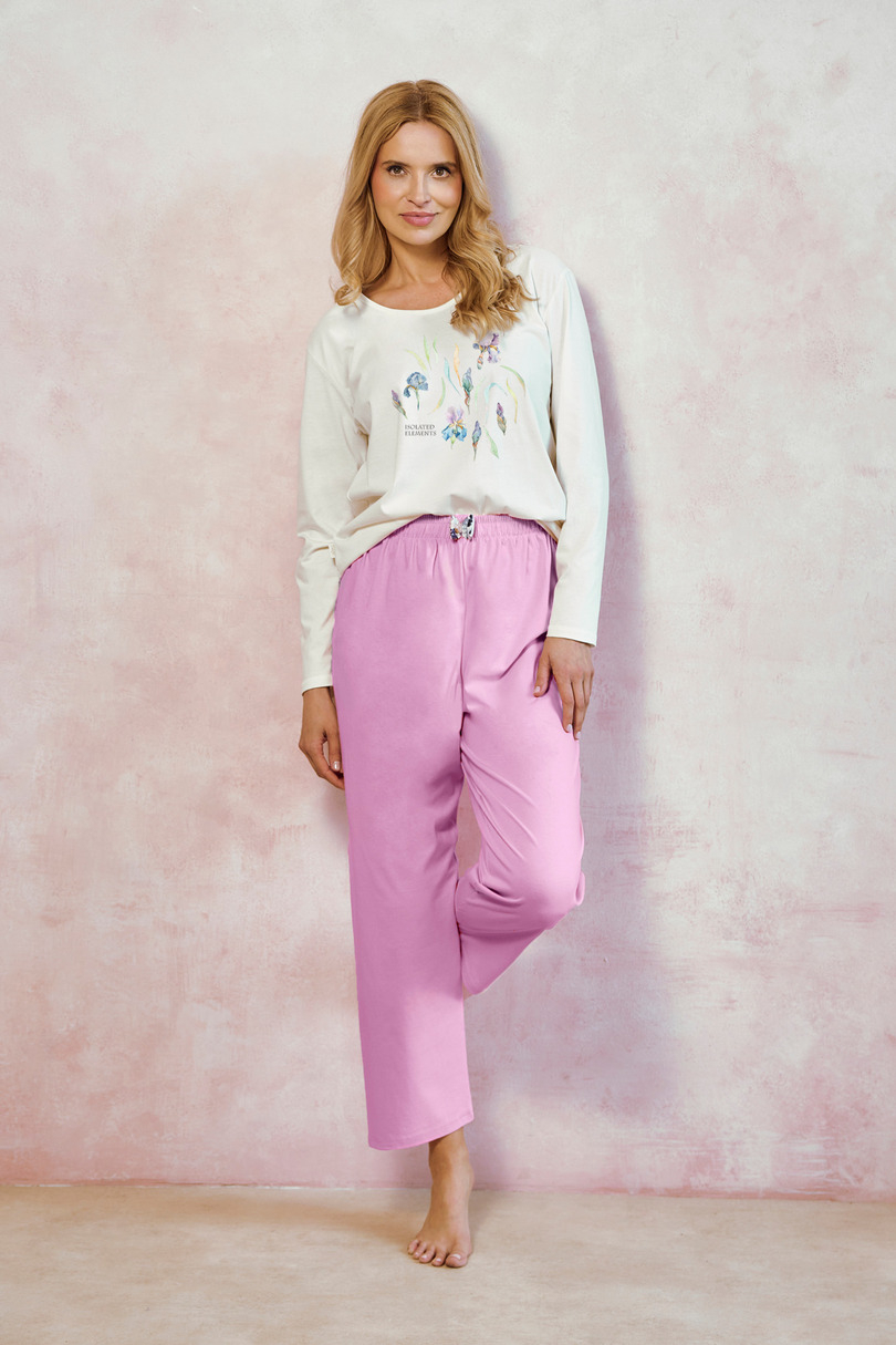 Długa piżama damska MONICA 3459 to idealna propozycja dla kobiet, które cenią sobie komfort snu i subtelny, kobiecy styl. Wykonana z delikatnej, 100% bawełny, doskonale otula ciało, zapewniając wygodę przez całą noc. Koszulka z długim rękawem ozdobiona została kolorowym, kwiatowym nadrukiem z przodu, a długie spodnie w kontrastującym kolorze dodają zestawowi nowoczesnego charakteru. W pasie znajduje się miękka gumka oraz ozdobna kokardka, które gwarantują idealne dopasowanie i estetyczne wykończenie.