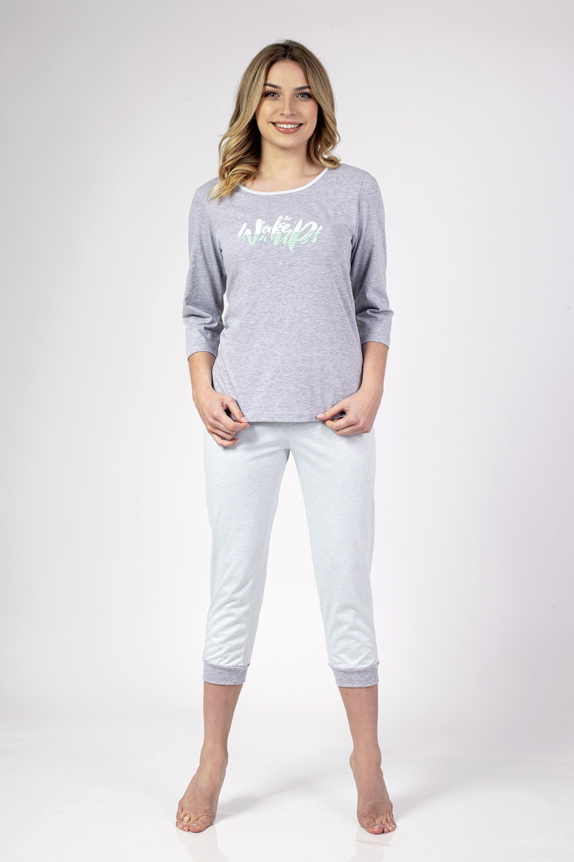 Piżama damska z rękawem długości 3/4, przód ozdobiony nadrukiem. Do kompletu spodnie rybaczki zakończone wygodnym ściągaczem.