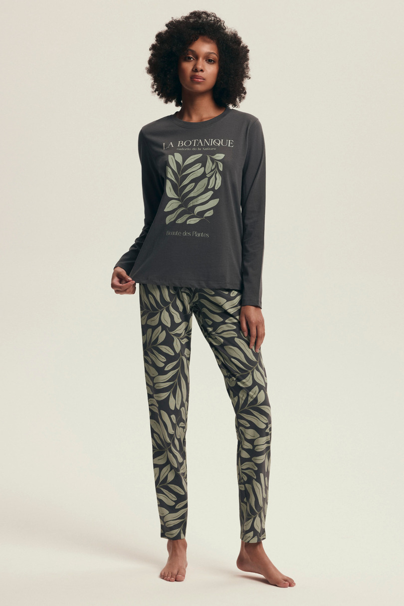Piżama damska DANNA 43685 AW25 to połączenie naturalnego komfortu i stylowego wzornictwa inspirowanego naturą. Wykonana w 100% z wysokiej jakości bawełny, gwarantuje oddychalność, miękkość i przyjemne uczucie na skórze przez całą noc. Bluzka z długim rękawem ozdobiona jest botanicznym nadrukiem z napisem „La Botanique – Beauté des Plantes”, który harmonijnie nawiązuje do roślinnych printów na spodniach. Długie spodnie z elastycznym pasem i wygodnym fasonem zapewniają maksymalną swobodę ruchów i dopasowanie bez ucisku. To piżama idealna na każdą porę roku – funkcjonalna, kobieca i pełna naturalnego uroku. Skład surowcowy: 100% Bawełna