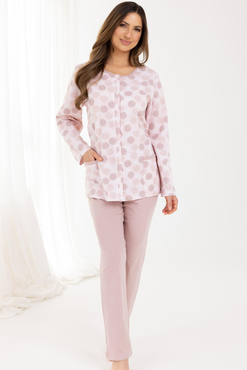 Piżama damska 710 J/25 – klasyczna elegancja i codzienna wygoda Piżama damska 710 J/25 to komfortowy komplet wykonany z wysokogatunkowej, 100% bawełny, który doskonale sprawdzi się o każdej porze roku. Wzorzysta koszulka z długim rękawem zapinana jest na guziki, co zapewnia wygodę użytkowania – idealna również dla mam karmiących. Model posiada dwie praktyczne kieszenie naszyte na dole bluzki. Do kompletu dołączone są jednolite, długie spodnie z elastyczną gumką w pasie obszytą bawełną, co gwarantuje wygodne i miękkie dopasowanie do sylwetki.