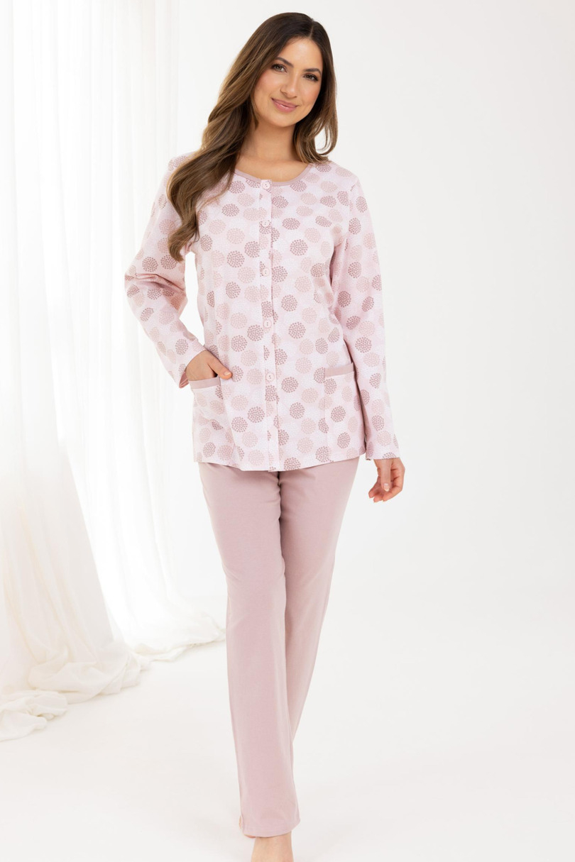 Piżama damska 710 BIG J/25 – klasyczna elegancja i codzienna wygoda Piżama damska 710 BIG J/25 to komfortowy komplet wykonany z wysokogatunkowej, 100% bawełny, który doskonale sprawdzi się o każdej porze roku. Wzorzysta koszulka z długim rękawem zapinana jest na guziki, co zapewnia wygodę użytkowania – idealna również dla mam karmiących. Model posiada dwie praktyczne kieszenie naszyte na dole bluzki. Do kompletu dołączone są jednolite, długie spodnie z elastyczną gumką w pasie obszytą bawełną, co gwarantuje wygodne i miękkie dopasowanie do sylwetki.