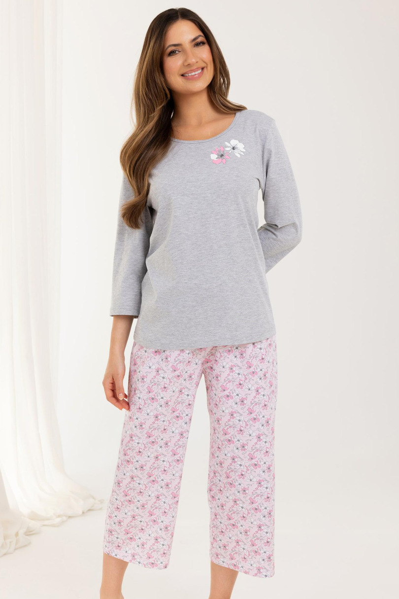Piżama damska 711 BIG J/25 – lekka, kobieca i idealna na cieplejsze noce Piżama damska 711 BIG J/25 to komfortowy i stylowy zestaw stworzony z myślą o kobietach ceniących wygodę oraz subtelny design. Wykonana w całości z wysokiej jakości bawełny, zapewnia oddychalność i miękkość przy każdym ruchu. Koszulka z rękawem 3/4, półokrągłym dekoltem i kwiatowym nadrukiem z przodu prezentuje się kobieco i elegancko. Całość uzupełniają wzorzyste spodnie o długości 3/4 – idealne na wiosnę i lato.