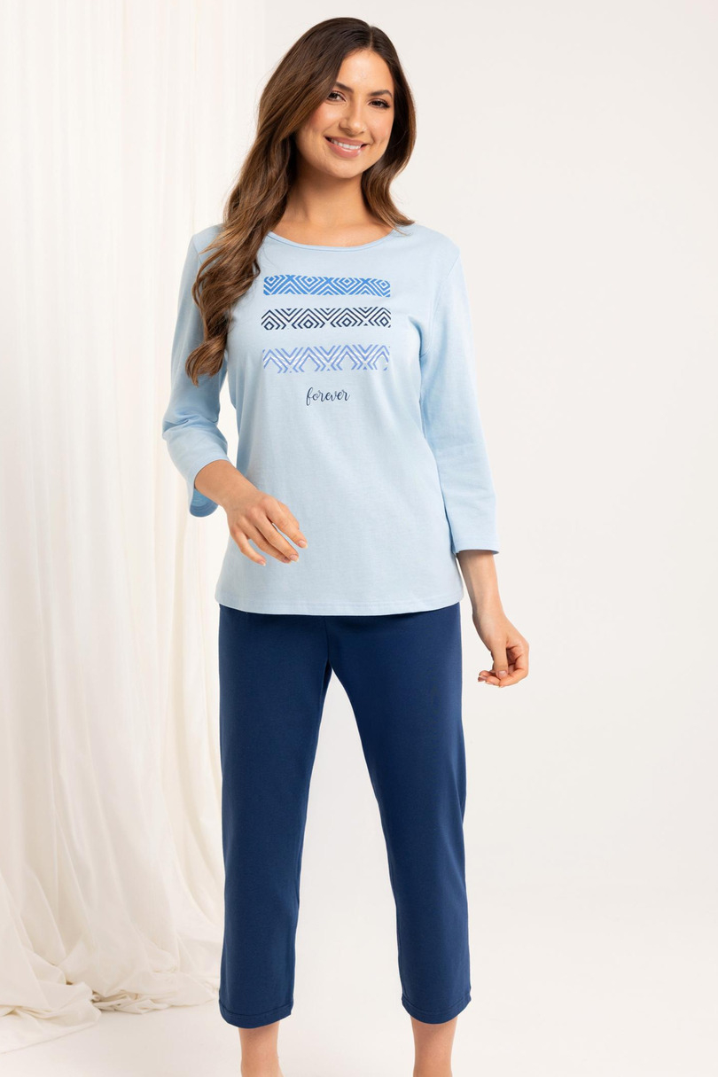 Piżama damska 709 J/25 – klasyczna forma i kolorystyczna świeżość Piżama damska 709 J/25 to wygodny i uniwersalny zestaw nocny wykonany z naturalnej, oddychającej bawełny. Jednolita koszulka z rękawem 3/4 została ozdobiona kolorowym nadrukiem z przodu, który dodaje całości lekkości i energii. Spodnie o długości 3/4, również w jednolitym kolorze, zapewniają komfort noszenia i swobodę ruchów, szczególnie w cieplejsze dni. Komplet zapakowany w foliowy worek – praktyczny wybór także na prezent.
