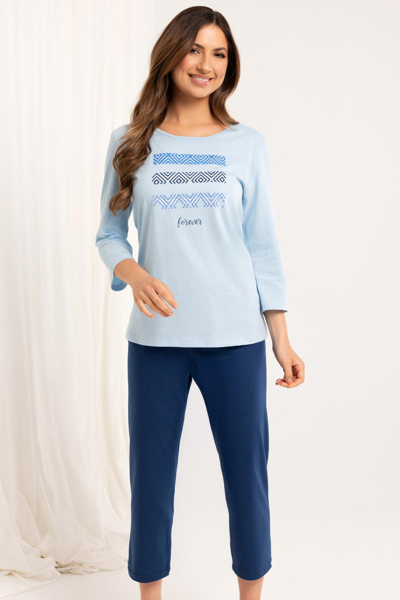 Piżama damska 709 BIG J/25 – klasyczna forma i kolorystyczna świeżość Piżama damska 709 BIG J/25 to wygodny i uniwersalny zestaw nocny wykonany z naturalnej, oddychającej bawełny. Jednolita koszulka z rękawem 3/4 została ozdobiona kolorowym nadrukiem z przodu, który dodaje całości lekkości i energii. Spodnie o długości 3/4, również w jednolitym kolorze, zapewniają komfort noszenia i swobodę ruchów, szczególnie w cieplejsze dni. Komplet zapakowany w foliowy worek – praktyczny wybór także na prezent.