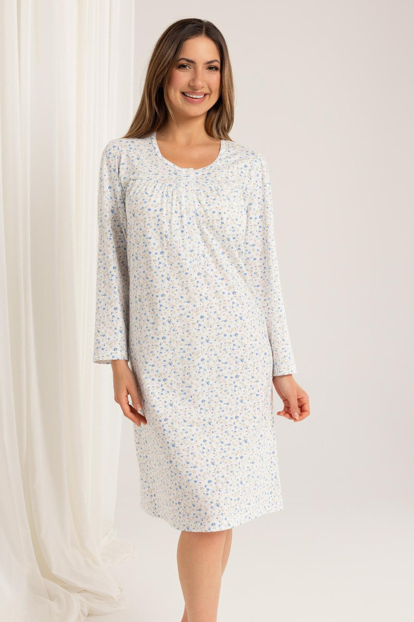 Koszula nocna damska 015 BIG J/25 – delikatna bawełna i klasyczna elegancja Koszula nocna 015 BIG J/25 to elegancki i funkcjonalny model, uszyty z wysokiej jakości, wzorzystej bawełny. Miękki i oddychający materiał gwarantuje komfort noszenia, a klasyczny fason doskonale sprawdza się zarówno do spania, jak i relaksu w domowym zaciszu. Koszula posiada długi rękaw oraz delikatnie marszczony dekolt zapinany na guziczki – co czyni ją także praktyczną opcją dla mam karmiących. Długość za kolano zapewnia dodatkową wygodę i ochronę w chłodniejsze wieczory.