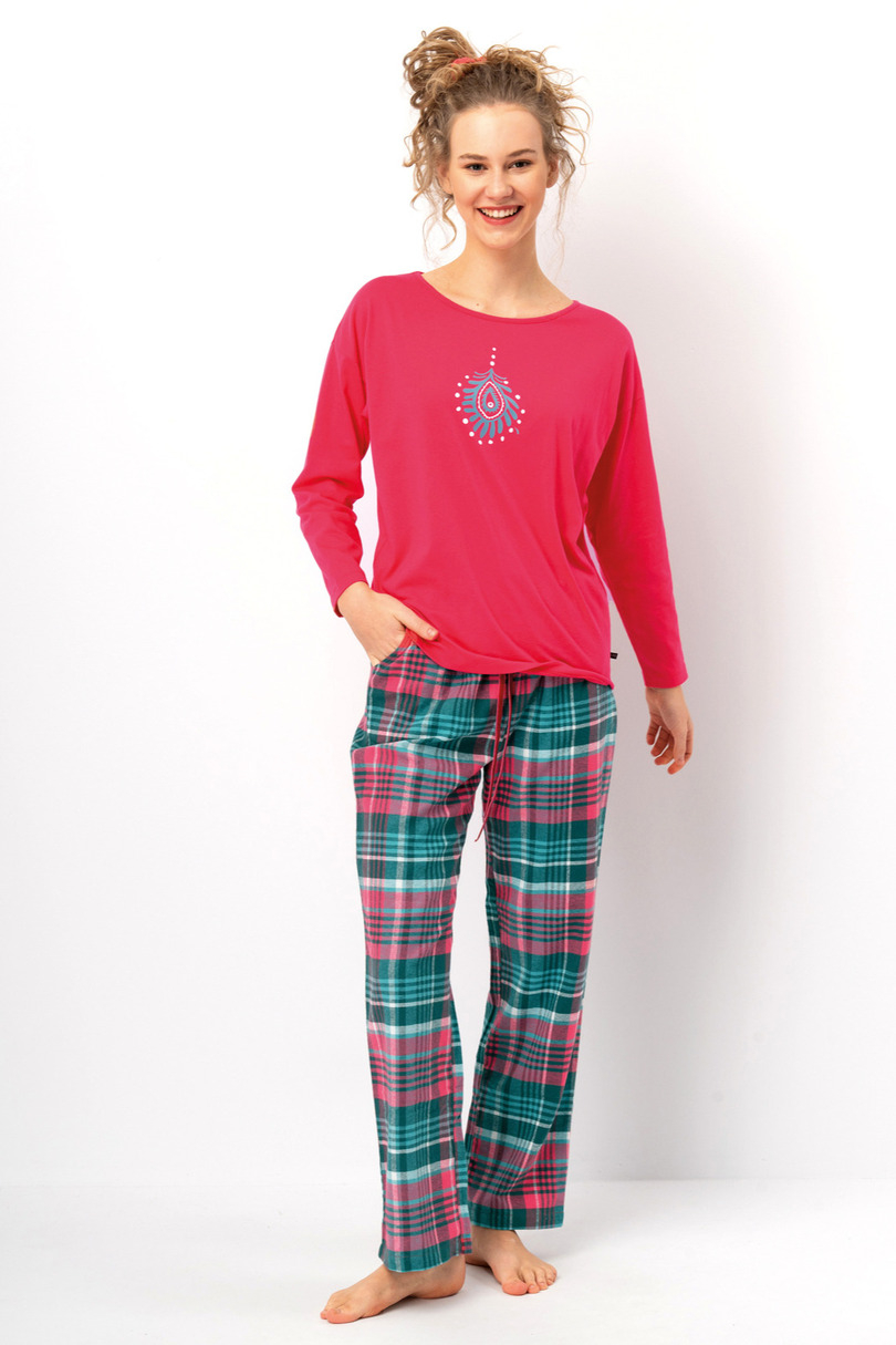 Ta damska piżama to połączenie ciepła, wygody i radosnych kolorów. Góra wykonana z miękkiej bawełny w intensywnym różowym odcieniu posiada długi rękaw oraz ozdobny nadruk w centralnej części, nadający jej oryginalnego charakteru. Spodnie z wysokiej jakości flaneli bawełnianej w zielono-czerwoną kratę zapewniają komfort termiczny i swobodę ruchów. Elastyczny pas z dodatkowym wiązaniem umożliwia idealne dopasowanie do sylwetki. Ten zestaw sprawdzi się nie tylko jako piżama na zimowe noce, ale także jako wygodny strój do domowego relaksu. Góra: 65% Bawełna, 35% Poliester Spodnie: 100% Bawełna Flanela