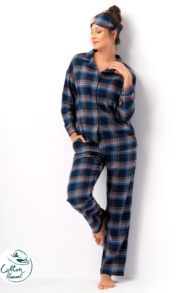 Piżama damska z miękkiej bawełny flanelowej to idealny wybór na zimowe wieczory i poranki. Wzór w elegancką granatowo-brązową kratę nadaje jej klasycznego, ponadczasowego charakteru. Góra w formie koszuli zapinanej na guziki posiada kołnierzyk i kieszonkę na piersi, łącząc wygodę z estetyką. Spodnie o prostym kroju i elastycznym pasie gwarantują swobodę ruchów i komfort podczas snu. W zestawie znajduje się dopasowana opaska na oczy, która pozwala cieszyć się spokojnym, nieprzerwanym snem. To komplet łączący praktyczność, ciepło i kobiecy styl. Skład: 100% Bawełna Flanela