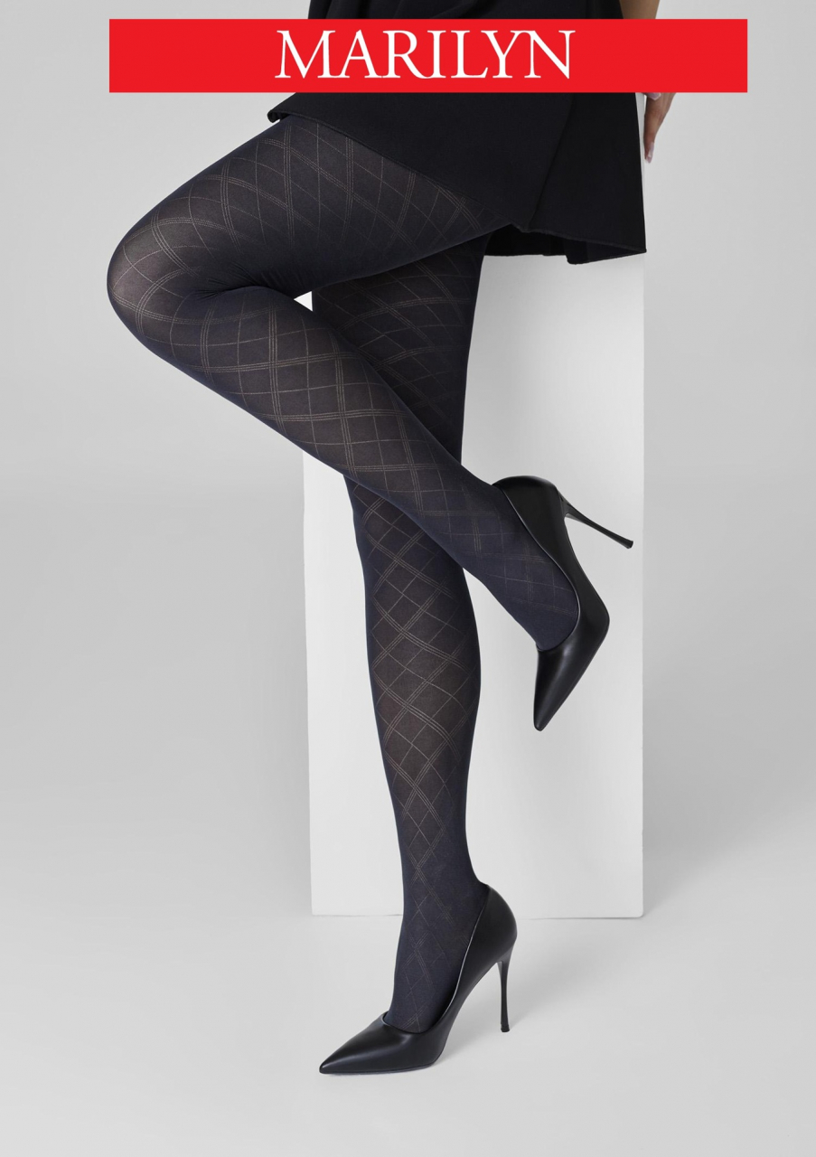 Rajstopy 40DEN z wyraźnym, żakardowym wzorem w postaci szeroko rozstawionej siatki rombów, który tworzy mocny, graficzny akcent na nodze. Elastyczny pas, mały klin i niewidoczne wzmocnieniem palców. Skład: 87% poliamid, 12% elastan, 1% bawełna.