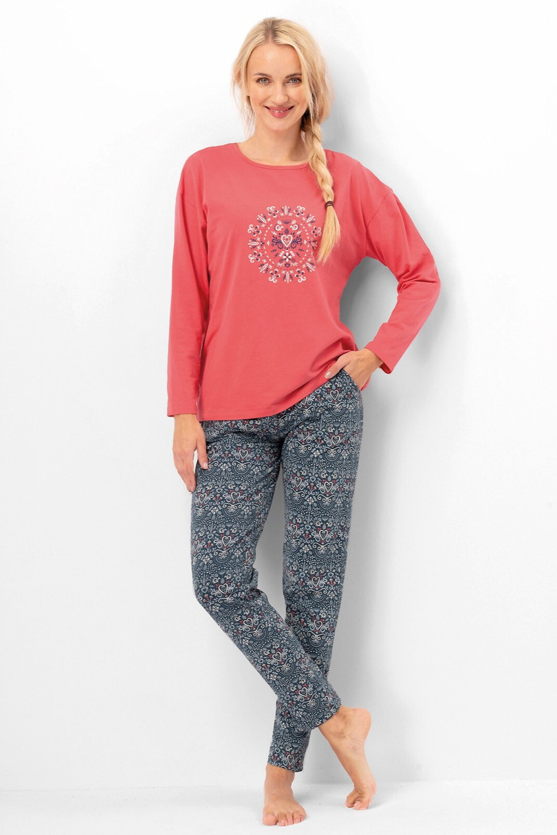 Piżama damska LNS 703 B25 to komfortowy i stylowy komplet wykonany z przyjemnej w dotyku dzianiny (95% bawełna, 5% elastan). Koszulka z długim rękawem i półokrągłym dekoltem ozdobiona jest subtelnym nadrukiem z przodu, a jej wydłużony, zaokrąglony tył nadaje całości nowoczesnego charakteru. Do zestawu dołączone są długie spodnie o wzorzystym designie i delikatnie zwężanych nogawkach, które świetnie układają się na sylwetce. Praktyczne kieszenie po bokach zwiększają wygodę codziennego noszenia. Elastyczna gumka w pasie gwarantuje idealne dopasowanie, a naturalny materiał zapewnia przewiewność i miękkość, idealną na noc i domowy relaks.