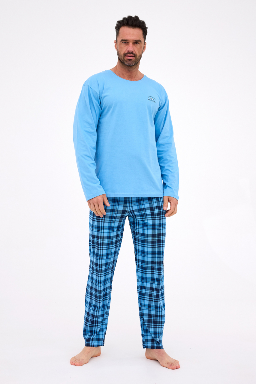 Piżama męska Cornette DR 124/310 Ready to klasyczny zestaw dla mężczyzn, którzy cenią komfort i naturalne materiały. Wykonana w 100% z wysokogatunkowej bawełny, jest miękka, przewiewna i przyjazna dla skóry. Koszulka z długim rękawem i półokrągłym dekoltem ozdobiona została subtelnym nadrukiem na piersi, dodającym jej sportowego charakteru. Do kompletu dołączone są długie spodnie w stylową kratkę z elastyczną gumką w pasie, obszytą bawełną, co zapewnia wygodę i swobodę ruchów. To doskonała propozycja na chłodniejsze noce i domowy relaks.