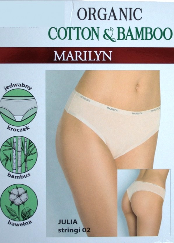 Stringi o minimalistycznym designu, niewidoczne pod ubraniem, wykonane z miękkiej, organicznej bawełny i włókien bambusowych. Fason typu thong optycznie wydłuża nogi. Skład: 94,5% wiskoza, 5,5% elastan.