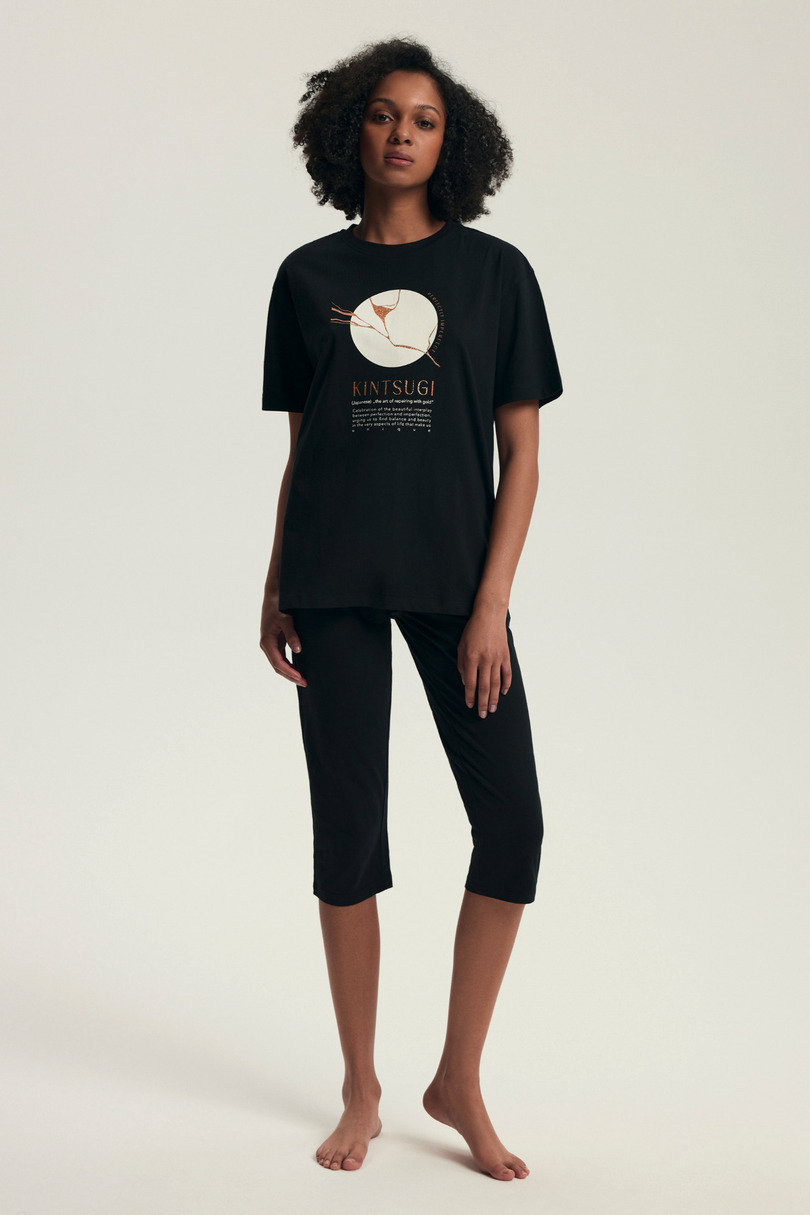 Piżama damska DAIROKU 43728 AW25 to idealna propozycja na cieplejsze noce i wygodny wypoczynek w domowym zaciszu. Uszyta w 100% z oddychającej bawełny, zapewnia naturalny komfort, miękkość i pełną swobodę ruchów. Jej minimalistyczny styl zyskuje wyjątkowy charakter dzięki nadrukowi inspirowanemu japońską sztuką Kintsugi, która podkreśla piękno w niedoskonałościach. Zestaw składa się z luźnego T-shirtu z krótkim rękawem oraz spodni o długości 3/4 z elastyczną talią, które zapewniają wygodne dopasowanie bez ucisku. Całość w eleganckim, czarnym kolorze sprawdzi się nie tylko jako piżama, ale również jako stylowa odzież domowa.