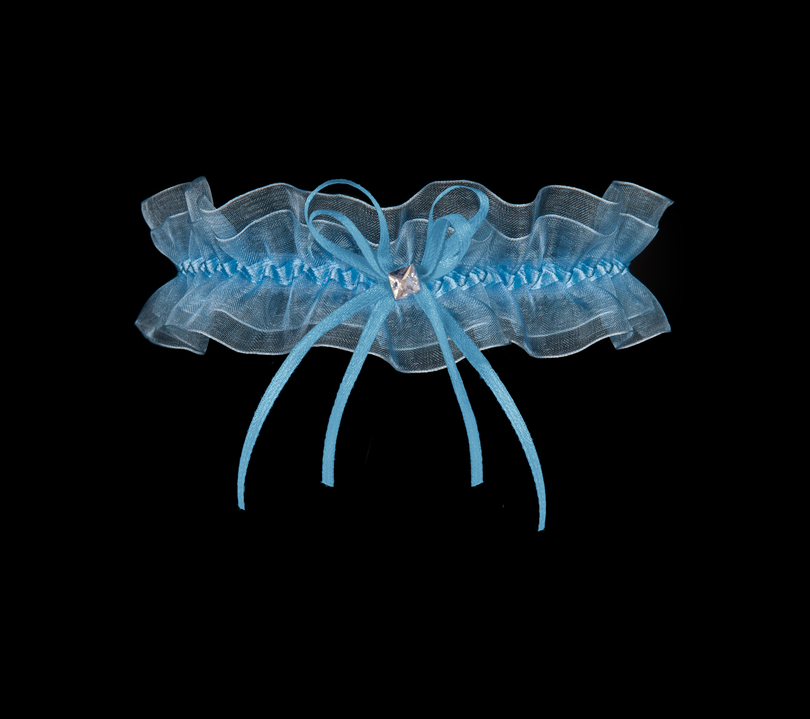 Niebieska podwiązka wykonana z delikatnego podwójnego szyfonu. Ozdobiona satynową kokardką z połyskującym koralikiem. Wewnętrzna strona podszyta silikonem. Skład 90% poliamid, 10% elastan.