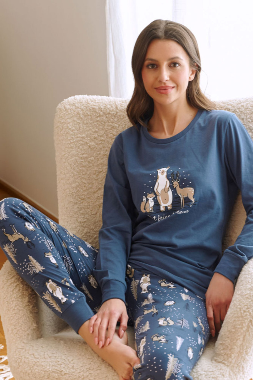 Piżama damska PM.4340 J/25 to idealne połączenie wygody, jakości i modnego wyglądu. Wykonana z miękkiej, 100% bawełny, zapewnia komfort snu przez cały rok. Górna część to koszulka z długim rękawem, ozdobiona kolorowym nadrukiem na przodzie. Długie spodnie o ciekawym, wzorzystym designie dodają całości charakteru. Wykończenia w postaci elastycznych ściągaczy przy dekolcie, mankietach, dole koszulki i nogawkach gwarantują idealne dopasowanie i wygodę noszenia. Całość zapakowana w estetyczne pudełko – świetny pomysł na prezent!