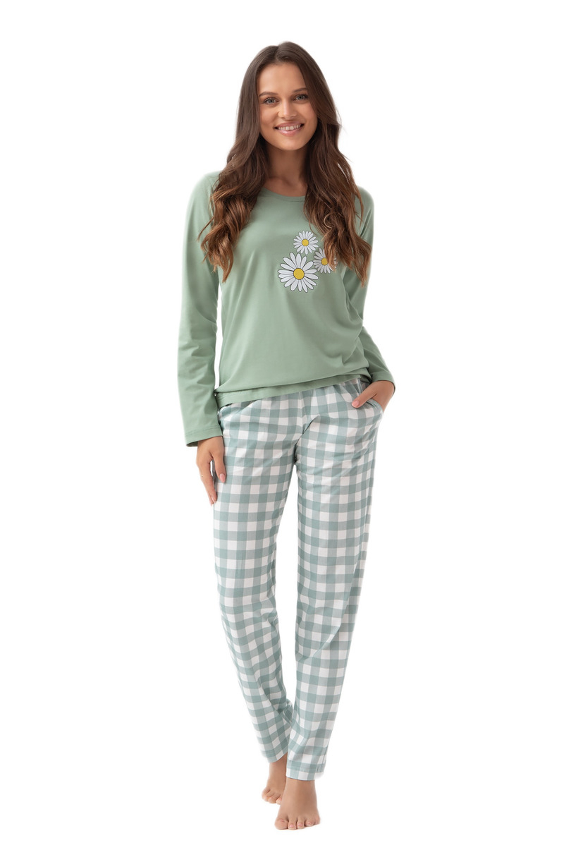 Piżama damska 320 J/25 – stokrotkowy urok i wygoda każdej nocy Stylowa piżama damska 320 J/25 to idealne połączenie kobiecego wzornictwa i codziennego komfortu. Górę zestawu stanowi zielona bluzka z długim rękawem i uroczym nadrukiem stokrotek, która wnosi do domowego stroju nutę świeżości i lekkości. Bluzka ma klasyczny, okrągły dekolt zapewniający wygodę noszenia. Do kompletu dołączono długie spodnie w kremowo-zieloną kratę, wyposażone w praktyczne kieszenie i luźny krój, gwarantujący pełną swobodę ruchów. Całość wykonana została z wysokiej jakości, 100% bawełny – miękkiej i oddychającej.