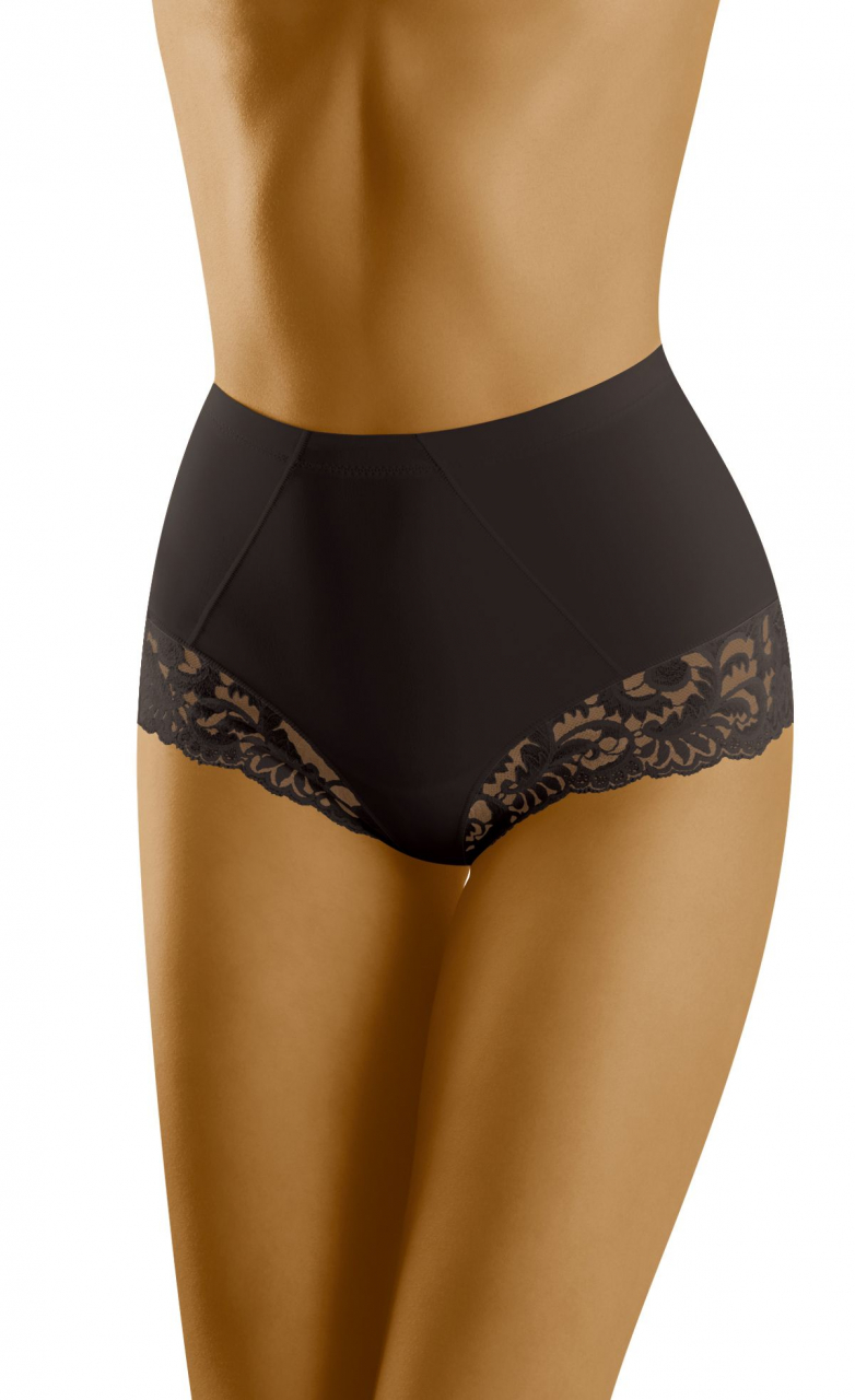 Bielizna do zadań specjalnych, w wersji na co dzień. Oto delikatnie korygujące figi, o nieco wyższym fasonie, ze śliczną koronkową lamówką wokół ud. Lamówka optycznie wydłuża nogi. Skład: 59% poliamid, 41% elastan.