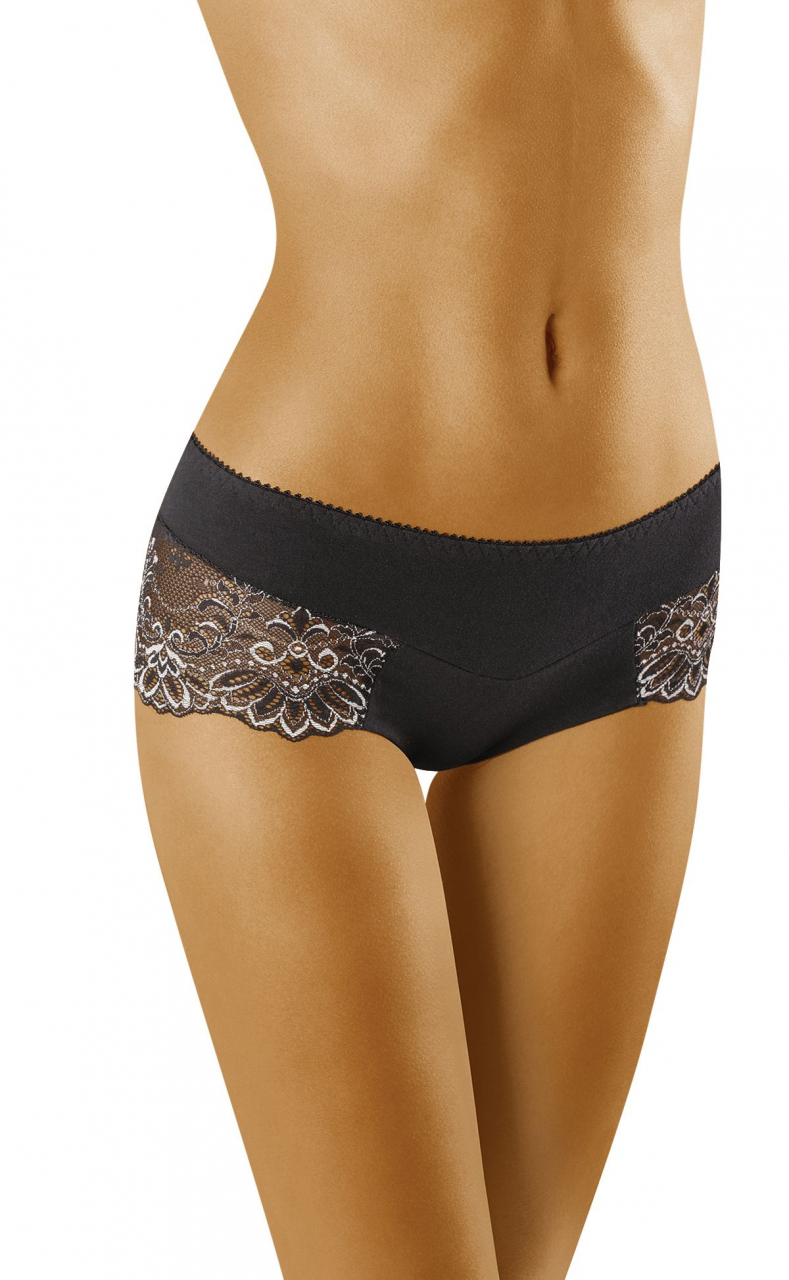 Stylowe, czarne szorty bogato zdobione koronką wokół pośladków. Piękny, niezwykle kobiecy model. Koronka podkreślona srebrzystymi motywami, ażurowa, sexy. Przód gładki, wysoce komfortowy, z koronkowym akcentem przy udach. Skład: 90% bawełna, 7% elastan, 3% poliamid.