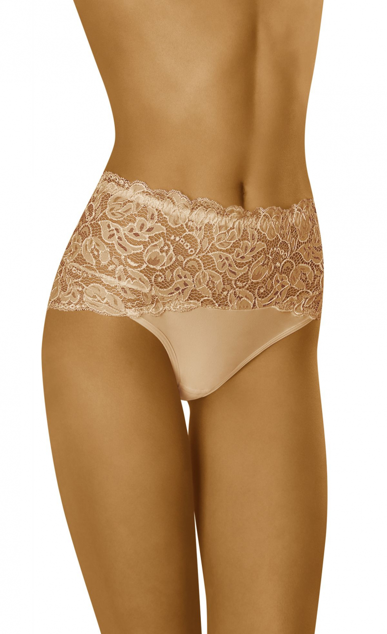 Koronkowe, wyższe figi, które zapewnią Ci wygodę i piękny, bardzo kobiecy wygląd. Miękkie i elastyczne, na delikatnej gumce w pasie. Skład: 83% poliamid, 17% elastan.